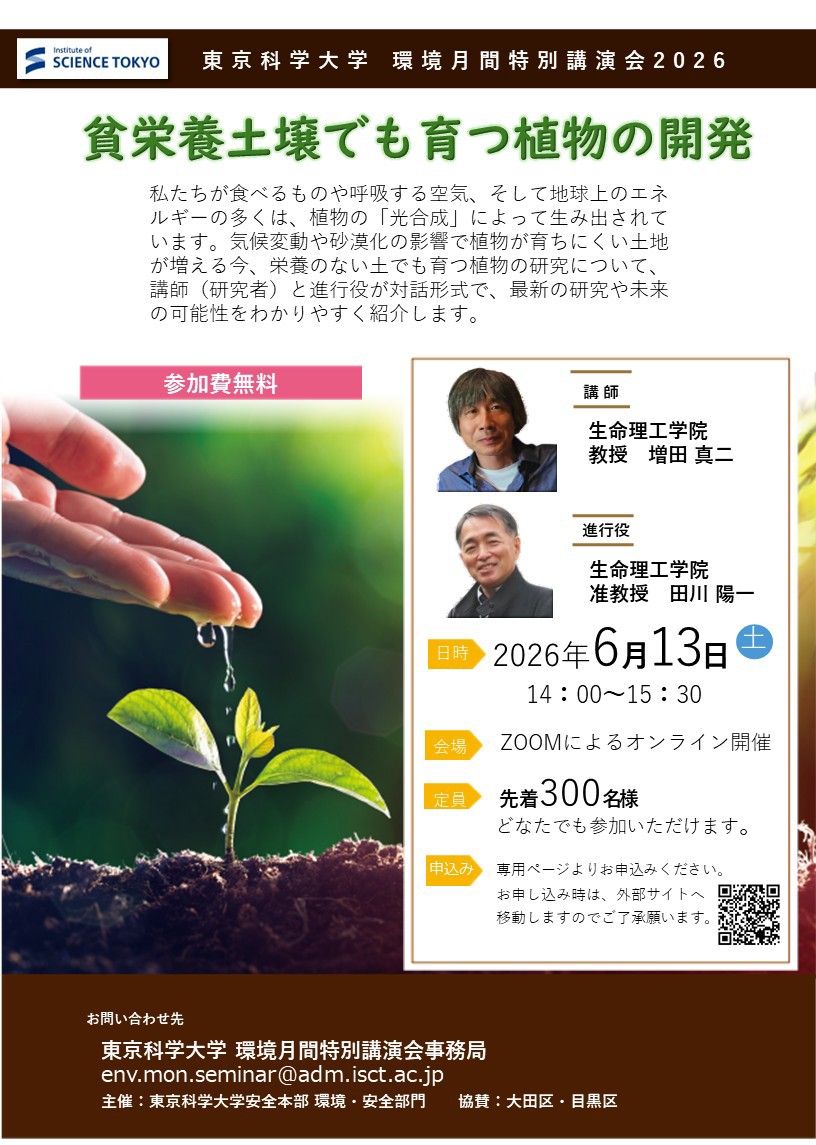 講演題目 貧栄養土壌でも育つ植物の開発 講師 東京科学大学 生命理工学院 教授 増田 真二 進行役 東京科学大学 生命理工学院 准教授 田川 陽一 日時:2026年6月13日(土)14:00~15:30 ※13:45より入室可 (講演及び質疑応答) 開催方法:Zoomによるオンライン開催 参加申込:専用ページよりお申込みください。 定員300名(先着順)参加費無料 https://zoom.us/webinar/register/WN_ljJFJaKHTjekdmfgyuzALg 注意事項:本講演会は「Zoom」のウェビナー機能を利用して開催いたします。 ご参加予定の環境でZoomが使用可能であることを「Zoomの接続テスト」https://zoom.us/testで事前にご確認ください。 なお、本講演会の録画、録音、撮影は固くお断りいたします。 ご協力のほどよろしくお願いいたします。 参加申し込み時にご提供いただきました個人情報は、個人情報保護法に基づき 厳重に保管し、本講演会に関するご連絡、今後の講演会の運営を目的に利用し、 それ以外の目的では利用いたしません。また、原則として第三者への開示も いたしません。 <問い合わせ先> 国立大学法人東京科学大学 安全本部 環境・安全部門 環境月間特別講演会事務局 Email: env.mon.seminar |